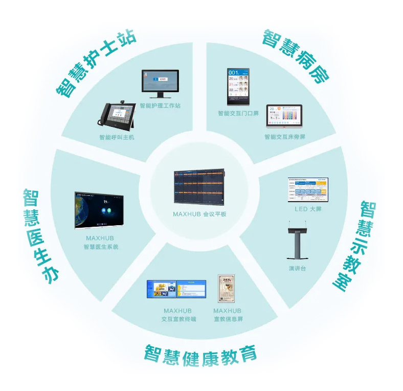 MAXHUE智慧医疗解决方案,基于 MAXHUB智慧协同平台软硬件能力,解决医疗信息化过程中各系统数据不互通、护理效率低、远程会诊体验差、院内宣教覆盖难等问题。